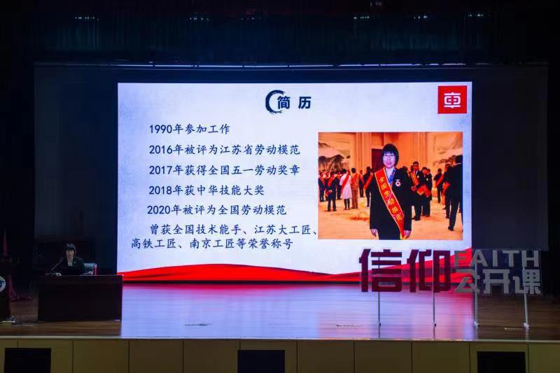 孙景南以“一名普通焊工的成长经历感悟”为题,讲述了她如何从木工专业转向焊工,慢慢成长为高级焊工的故事。她曾赴法国学习交流,从一开始法国人轻视女性拒绝其赴法交流,到后来被她高精尖的技术所折服,甚至一有难题立即向其求助,并称她为专家。在经历了无数的坎坷后,她迎来了角色的转换。她以自己经历给在场的同学们提了四点建议:第一,练就过硬的本领;第二,具备技术创新的能力;第三,怀有一颗感恩的心;第四,只有心怀梦想才能砥砺前行。