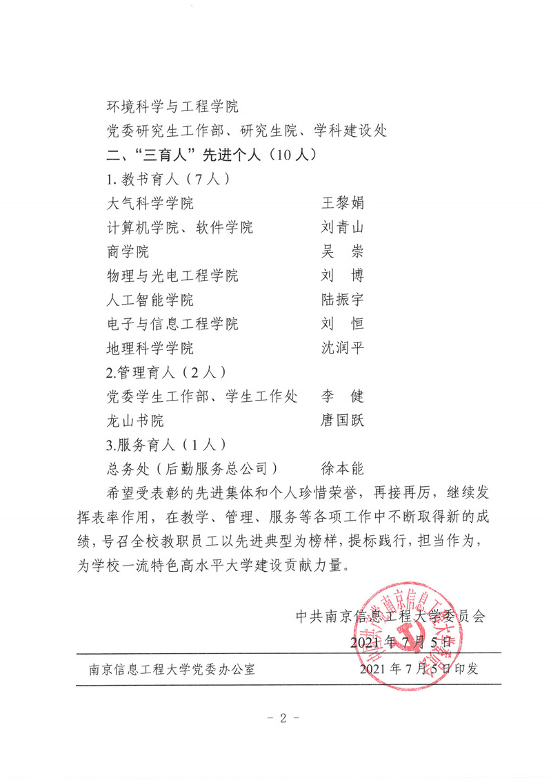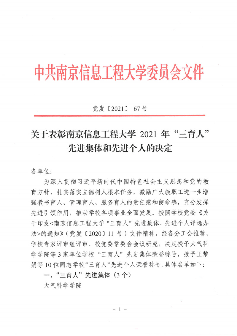 党发〔2021〕67号 关于表彰南京信息工程大学2021年“三育人”先进集体和先进个人的决定
