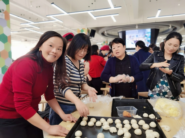 当天,我校西苑食堂桔薇面包房为来此参加活动的教工们专门提前准备好了制作食材和模具,由于前来参与活动的教职工多近五十人,按计划教工们被分成了三个大组,每组教工分别学做两个品种的甜点。另外,每个组都配备了一名高级专业烘培师进行手把手的示范和指导。这次活动选择制作的品种都是平时广受师生欢迎的甜品西点,有意大利蓝莓酥、葡式蛋挞,焦糖布丁,雪媚娘等六个品种。热心的桔薇面包房烘焙师首先给大家简单介绍了制作的步骤,接着他们又以专业和娴熟的手法进行了演示,使大家对烘焙有了初步了解。接着,大家便纷纷迫不及待地在指导下开始了和面、擀皮、压膜……在三位师傅的悉心指导下,自己动手,亲身体验,活动现场气氛热烈,大家热情高涨,欢笑声不断。