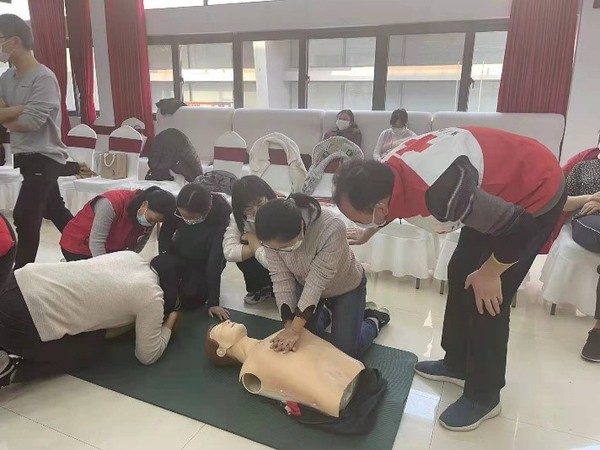 受训人员理论学习聚精会神,实习操作更是精益求精,大家分组合作,默念“切、撑、抬、捏、包、吹“口诀,或“轻拍重唤”施行心肺复苏术前判断伤员有无意识、或针对病症展开具体施救,场面热烈而有序。培训老师们耐心指导,及时指出并纠正不规范动作,帮助每位受训者准确掌握知识要点和操作技能。