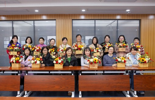 一花一世界,一叶一乾坤。花道是中国传统修身养性,陶冶身心的生活艺术。通过精心搭配花材使其变得更加的赏心悦目,不仅体现了自然与人的完美结合,还能形成花的独特语言,让观赏者解读与感悟。在插花课堂上,女教职工们跟随花艺老师的操作指引,用自己的心情与花草悄悄对话。黄色的向日葵、红色的玫瑰、纯白的洋甘菊、粉紫的康乃馨、红色的腊梅,姹紫嫣红的花儿在女教职工们的纤纤玉手中,舒展着艳丽的眉眼,摆动着柔媚的腰肢,在恬静的尤加利树枝的衬托下,花儿们传递着浓浓的爱与温情。
