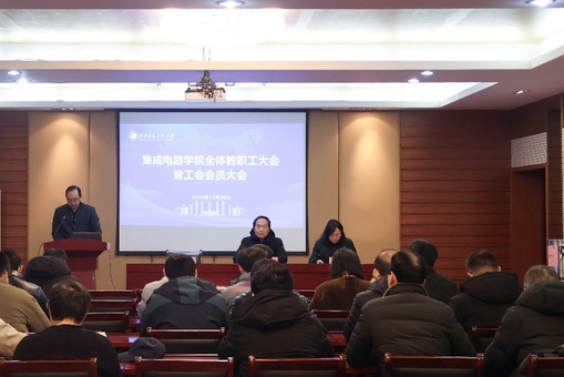 院长程知群围绕学科建设、师资队伍建设、实验室建设、人才培养以及对外合作交流等五个方面介绍了当下发展态势,剖析了现存问题,并指明了后续奋进方向。他鼓励教师积极寻求与浦口经开区、集成电路领域相关企业的深度合作,共同开展技术研发和人才培养,促进产学研深度融合,不断推动学院迈向新的发展高度。 在热烈的掌声中,集成电路学院全体教职工大会暨工会会员大会圆满落下帷幕。此次大会的召开,不仅增强了教职工的凝聚力和向心力,也为学院未来发展奠定了坚实的基础。学院将不断深化学科交叉和产教融合,力争在学科建设、师资队伍、科学研究、人才培养等方面取得新突破,为集成电路学院高质量发展贡献更大的力量。