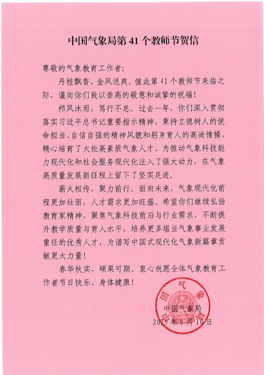 值此第41个教师节来临之际,中国气象局向南信大教育工作者发来贺信。