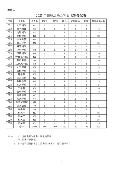 田径运动会相关要求参见学校体育运动委员会发布的《南京信息工程大学第五十五届学校田径运动会规程》,(详见通知:https://bulletin.nuist.edu.cn/content.jsp?urltype=news.NewsContentUrl&wbtreeid=1013&wbnewsid=54201)。教工组参赛要求补充如下: