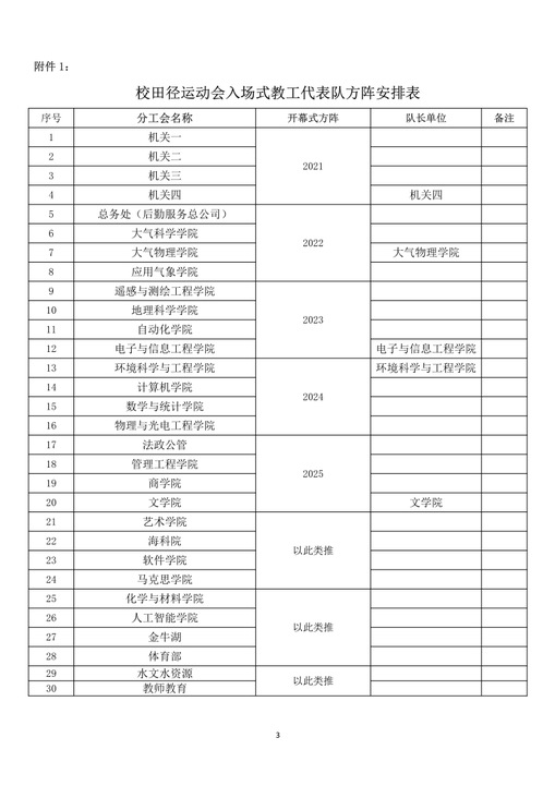 根据体委会要求,需组织教工代表方阵参加入场式,按照入场式方阵安排表(见附件1),10月底本届田径运动会开幕式,由文学院、商学院、管工应急和法政学院四个分工会各选派10名教职工参加,组成4×10入场方阵,组织练习、入场解说词、口号和旗手1人等具体事项由牵头单位文学院负责安排。