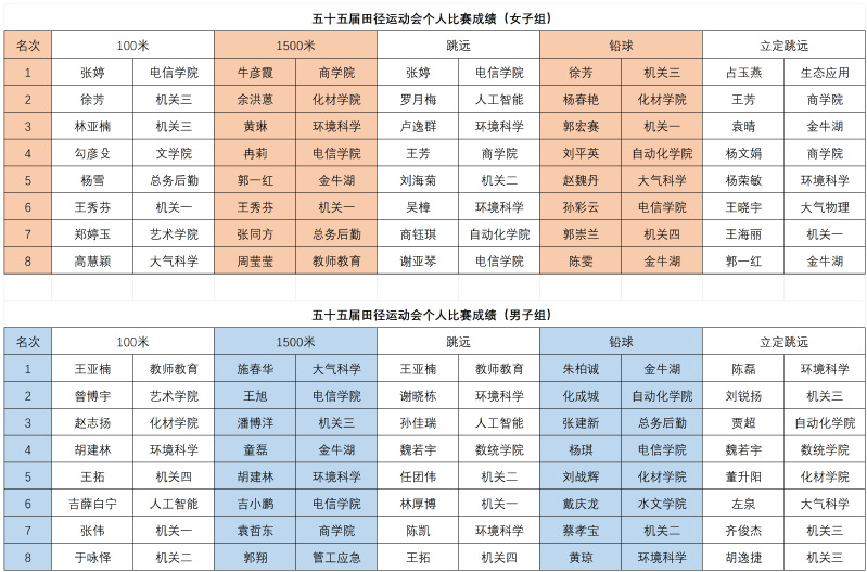 佳绩的背后,是学校各部门、各分工会精心高效的组织保障。自9月起,校工会统筹部署,各分工会广泛动员、精心选拔,利用业余时间组织训练。运动员们克服种种困难,刻苦磨砺、精益求精,终以最佳状态亮相赛场,赛出了水平,更赛出了风格。经过多轮紧张激烈的预赛与决赛,各项目前八名相继产生,获奖名单如下: