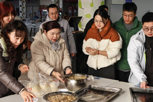 活动一始,“趣味包饺子” 环节便点燃了现场热情。食堂工作人员提前备好新鲜的面团、馅料与工具,教职工们自发分组,洗手挽袖迅速投入其中。大家分工协作,有的捏褶塑形创意十足,元宝形、月牙形、柳叶形的饺子在指尖翻飞,形态各异却同样饱含心意。不熟悉操作的教职工主动请教,经验丰富的同事耐心指导,欢声笑语中,一盘盘饱满的饺子整齐排列,不仅包裹着鲜香的馅料,更裹着教职工间的互助情谊与对新年的美好期盼。
