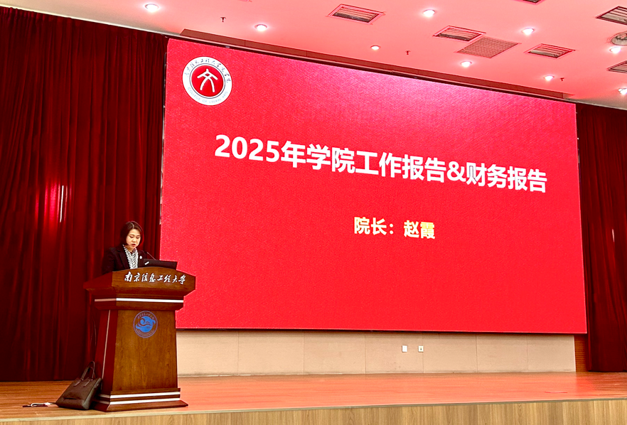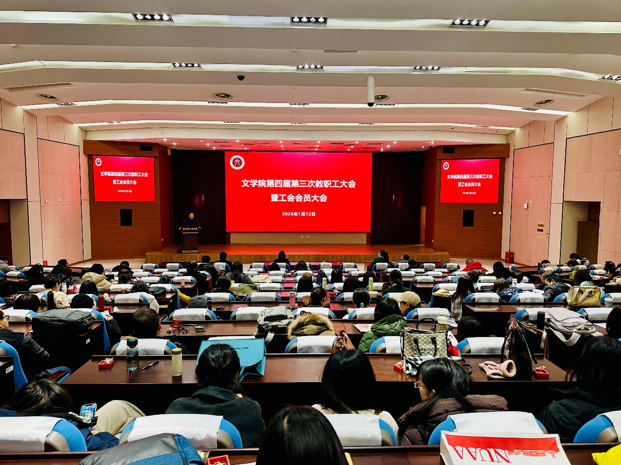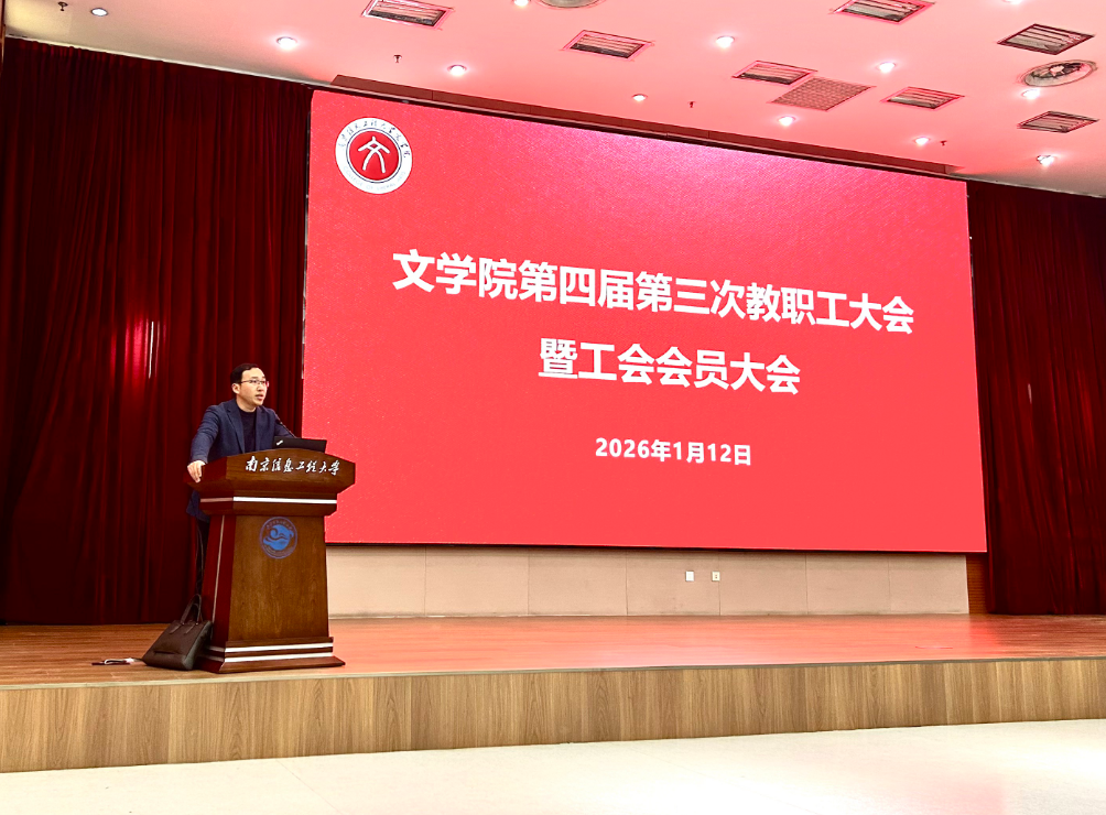 岁序更替,华章日新。2026年1月12日下午14:00,南京信息工程大学文学院第四届第三次教职工大会暨工会会员大会在气象楼一楼报告厅隆重召开。文学院全体教职工齐聚一堂,共同回顾过去一年的奋斗历程,擘画学院高质量发展的新蓝图,大会由学院党委书记郭雨主持。