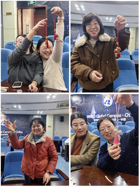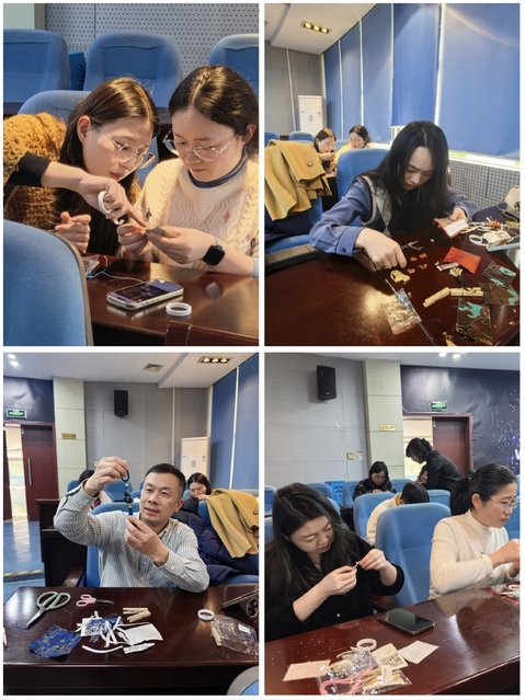 活动现场准备了不同造型寓意吉祥的宋锦手作材料包:小马呼应即将到来的2026马年,承载“一马当先”的新岁期许;葫芦寓“福禄安康”之愿,蝴蝶藏“灵秀雅致”之韵。本次活动特别邀请大气科学学院刘伟老师担任手工指导嘉宾,现场示范教学,参与人员多数为女教师,她们以细致手法梳理锦线、固定造型,将宋锦的精致纹理与吉祥寓意融入作品;同时也有几位男教师加入创作行列,在穿绳、拼接的过程中摸索技巧,现场交流声与轻笑声交织,氛围温馨融洽,最后,大家将亲手制作的“吉祥好物”收入囊中,把非遗温度与新年期许一同带回日常。