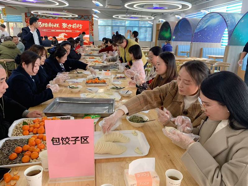 活动以“暖心联动、聚力赋能”为核心,分工会周密部署、精准落实各环节,确保活动有序开展。现场暖意氤氲,大家围坐协作、巧手包饺,在和面擀皮间畅谈工作心得、增进情谊;掼蛋赛场上,选手们自由组队、默契搭档,在智力比拼中凝聚团队合力。猜歌名、抽奖、集体合影等环节轮番上演,搭配热气腾腾的水饺,既传递出浓浓的新春暖意,更生动勾勒出“校企同心、聚力奋进”的美好图景。党委书记朱庆峰在致辞中对全体后勤同仁及企业员工坚守岗位、筑牢校园保障防线的付出表达了由衷谢意,强调此次活动既是新春团圆之举,更是深化校企联动的重要纽带,助力双方凝聚共识、携手共进。