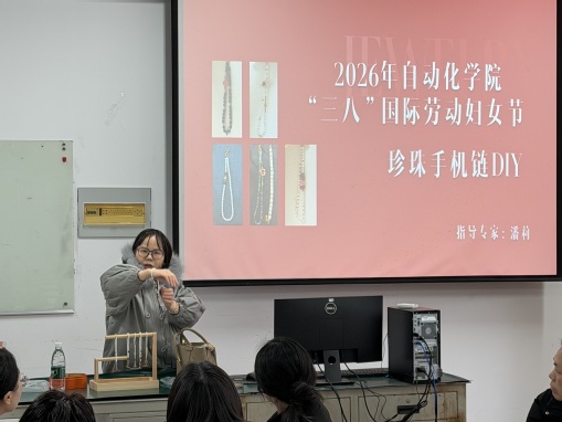 阳春三月,万物复苏。为庆祝即将到来的“三八”国际劳动妇女节,丰富女教职工的精神文化生活,缓解工作压力,3月4日下午两点,自动化学院分工会在学科3号楼S205教室举办了一场别开生面的DIY珍珠手机链活动,47名女教职工报名参加。