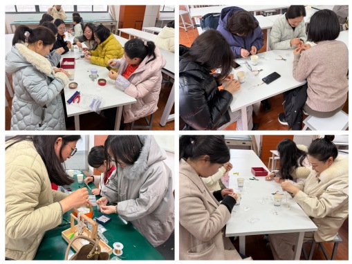 活动现场气氛温馨而热烈,桌上摆满了各式各样的珍珠、金属配件及制作工具。活动伊始,潘莉老师为大家详细讲解了珍珠手机链的设计理念、配色技巧以及具体的制作步骤。在老师的示范下,女教职工们纷纷化身“手工达人”,大家兴致勃勃地挑选自己心仪的珍珠与配饰,穿针引线、巧妙构思。