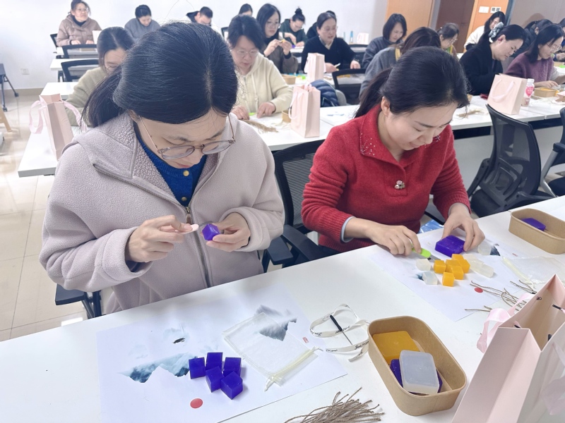 分工会贴心准备了半成品皂基与便携材料包,让老师们可根据课表错峰参与,确保老师们都能在忙碌间隙,寻得片刻手作的宁静。活动现专业老师现场讲解了精油香皂的制作秘诀和功效:从融皂、调配香氛,到入模、静置定型,每一步都藏着生活的巧思。老师们兴致盎然地挑选专属配方:紫色薰衣草皂以温柔香气舒缓紧绷神经,助眠解压;黄色柠檬皂携清新果香提亮肤色,唤醒活力;绿色薄荷皂带着沁凉气息醒脑提神;白色栀子花皂则控油滋润,香气缓解压力,提升心情。大家围坐切削,你帮我赶,指尖流转间,一串串晶莹剔透、色彩斑斓的葡萄香皂渐渐成型,承载着对生活的热爱与同事间的温情。