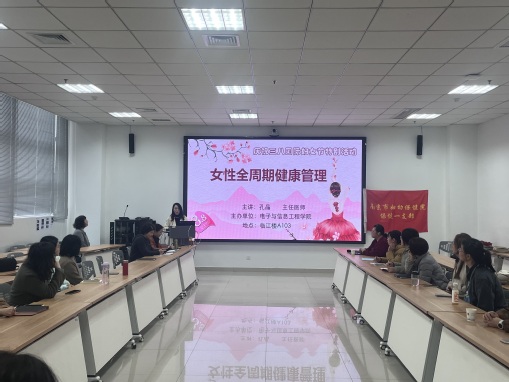 为庆祝“三八”国际妇女节,关爱女教职工健康,3月12日下午,电子与信息工程学院分工会举办“女性全周期健康管理”专题讲座。活动特邀南京市妇幼保健院主任医师孔晶主讲,学院党委书记张明菊主持,四十余名女教职工参与学习。