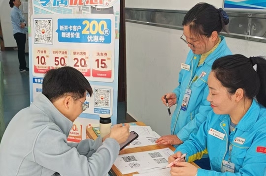 4月26日,中苑教工活动中心,中国石油工作人员提前布置好服务台,从手机注册、卡片申领到政策答疑,提供全流程“一对一”指导,并详细告知优惠卡的使用方式。不少教职工利用午休时间前来办理,现场秩序井然,服务高效便捷。